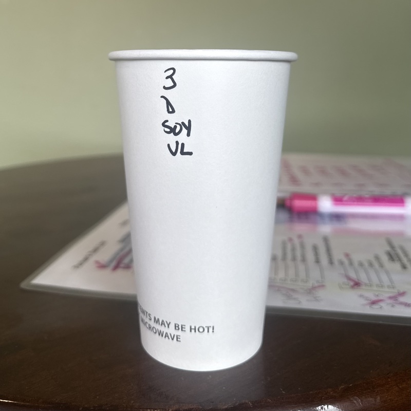 The Cashier or Floater will need to mark each drink ordered before handing the cup off to the barista. Proficiency in these markings will improve accuracy and timing.